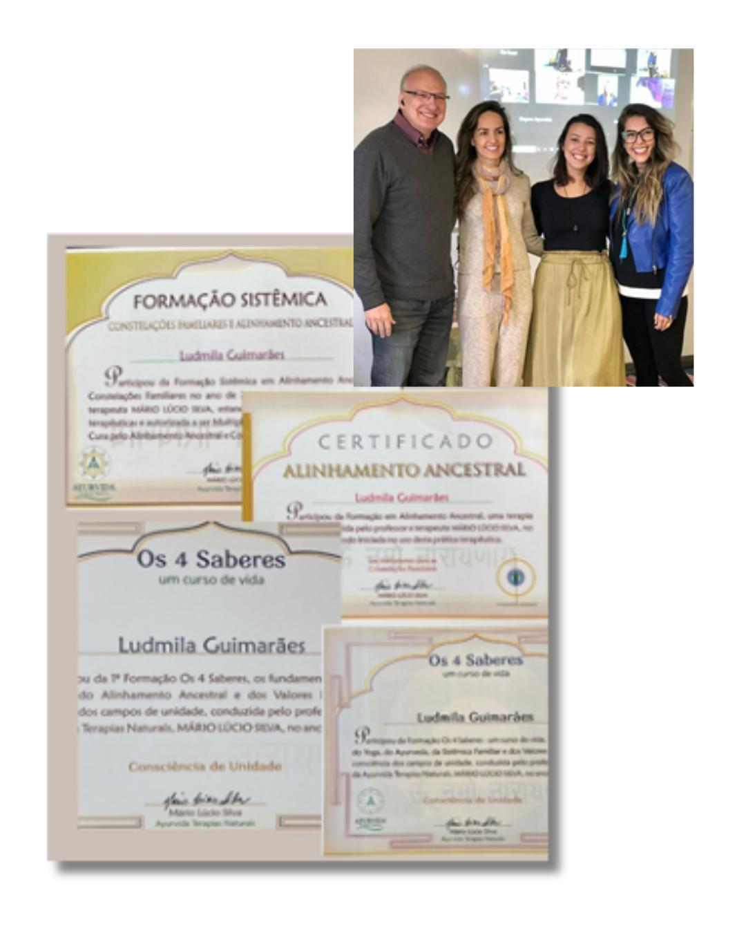 Minha formação foi construída por meio de anos de estudos, seminários e vivências ao lado de professores que marcaram significativamente esse caminho, entre eles, Sophie Hellinger, Hermann Furthmeier, Evelyne Furthmeier, Susanne Trübenecker, Edith Bieler-Sonnenholzner e Michaela Groer, além de importantes nomes no Brasil como Renato Shaan Bertate, Solange Bertão, pioneira em sua formação inicial nas constelações, e Mário Lúcio Silva, com quem aprofundou estudos em Constelação Familiar, Alinhamento Ancestral, Valores Humanos, Yoga e Ayurveda.